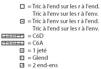 3e r: 2 end. 10 env. Trav 3e r du panneau torsadé sur 21 m suiv. 10 env. 2 end. 4er: 2 end. *(1 end. 1 env. 1 end) le tout dans la m suiv. 3 env-ens. Rép de * une fois de plus. 2 end. Trav