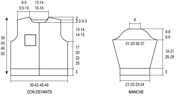 A 13-14-14-15 cm de haut. d’emmanchure (78-88-92-102 rgs de haut. tot.), rab. à gauche tous les 2 rgs 1 fois 4-5-6-7 m., 1 fois 3 m., 2 fois 2 m.
