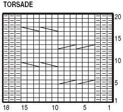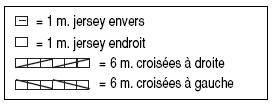 12-13-14-16 m. jersey endr., 18 m. torsade en répart. 3 augm. au 1er rg, 5-6-7-8 m. jersey endr. (= 35-37-39-42 m.).