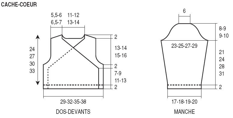 A 13-14-15- 16 cm de haut. d’emmanchures (76- 84-94-104 rgs de haut. tot.), rab. de ch. côté tous les 2 rgs :