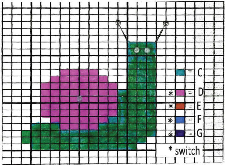 NOTE: pour chaque cercle du corps, changer les couleurs comme indiqué sur la grille - couleurs D-G - et suivre l'image pour l'emplacement de chaque couleur .