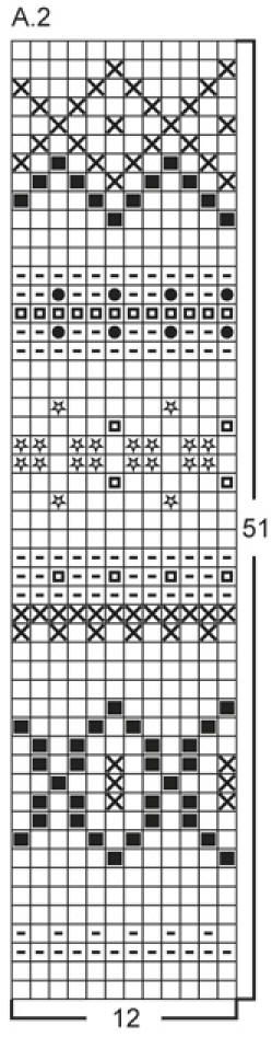 Si vous voulez tricoter des jambières au lieu des chaussettes, tricoter en suivant les instructions ci-dessous jusqu'à ce que l'ouvrage mesure 29-31-33 cm MAIS ne pas diminuer au milieu dos (conserver juste les diminutions au 1er et dernier tour de A.2) = 72-84-84 m.