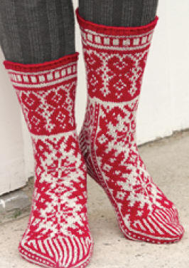 Après les diminutions du talon, relever 12-13-14 m de chaque côté du talon (relever alternativement en rouge et en gris perle clair pour correspondre au diagramme A.4) et reprendre les 33-39-39 m en attente = 72-80-82 m.