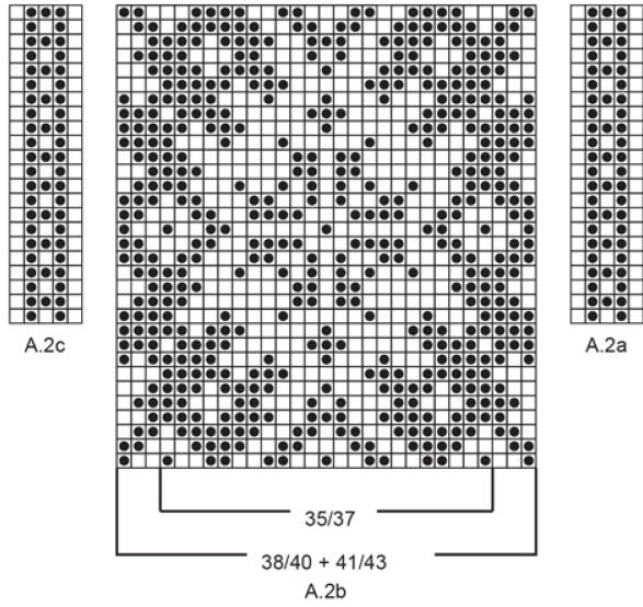 Continuer les 33-39-39 m au-dessus du pied en suivant A.2a, A.2b et A.2c comme avant, tricoter les mailles du dessous du pied en A.4 comme avant.