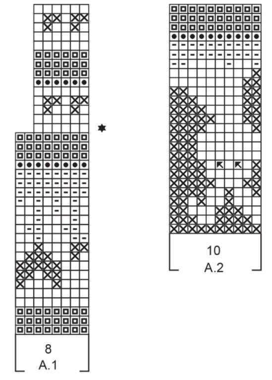 Tricoter ensuite en suivant le diagramme A.1 (= 8 mailles) 8-8-9 fois en largeur).