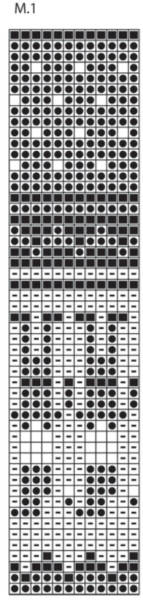 Tricoter 1 tour end en rouge puis tricoter M.1 sur toutes les mailles (= 4-4-4-5 fois le motif tout le tour).