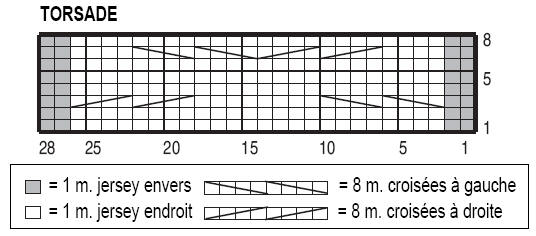 A 25-26-27-28 cm de haut. de point de blé, tric. 15-17-19- 21 m. point de blé, sur la torsade :