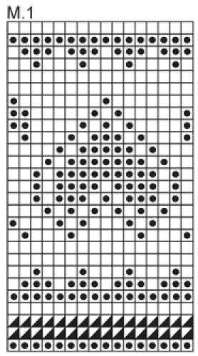 Continuer avec les aiguilles doubles pointes 3,5 en suivant M1 (= 16 m) sur toutes les mailles, EN MÊME TEMPS, au dernier rang de M1, répartir 4-0-0 diminutions = 60-64-64 m.