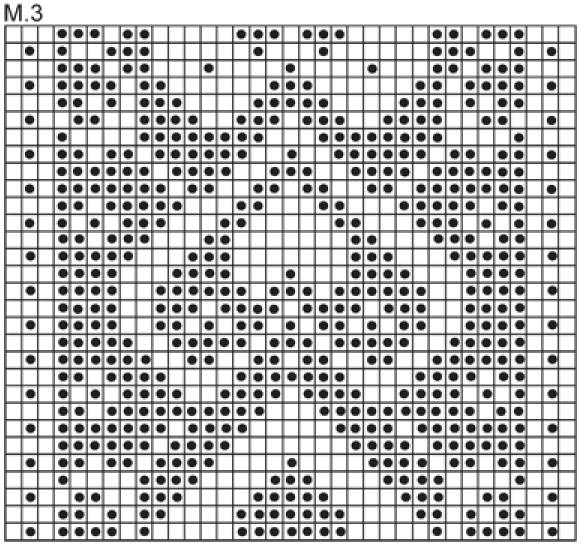 Continuer en suivant M2 (= 4 m) sur toutes les mailles, EN MÊME TEMPS, au dernier rang de M2, répartir 4-4-4 diminutions = 56-60-60 m.