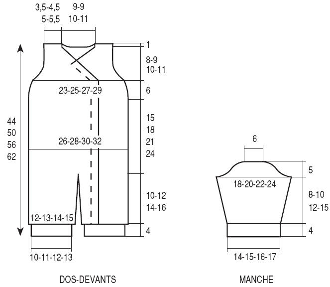 A 29-34-39-44 cm (120-140-160- 180 rgs) de haut. tot., dim. à droite comme au dos.