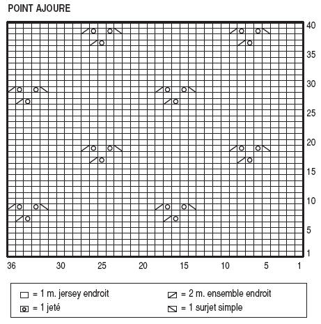 Un carré de 10 cm point ajouré = 28 m. et 40 rgs.