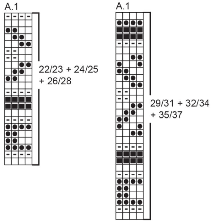 tricoter ens à l'end les 2 dernières m avant les 16-18-20-22-24-26 m du dessus du pied et tricoter ens torse à l'end (= dans le brin arrière au lieu du brin avant) les 2 premières m après les 16-18-20-22-24-26 m.