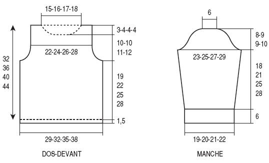A 13-14-15- 16 cm de haut. d’emmanchures (88- 98-110-120 rgs de haut. tot.), rab. de ch. côté 1 fois 7-8-9-10 m.,