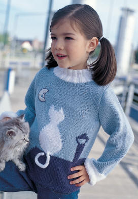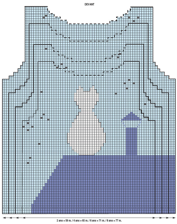 Pour 2 ans et 4 ans, tricoter ensuite le chat à 7 m. du bord gauche du toit comme sur la grille, et la cheminée à 14 m. du chat.
