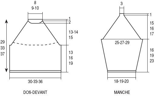 Comme le dos mais au 1er rg du raglan, laisser en attente les 15-17-19 m. centrales, puis de ch. côté tous les 2 rgs 2 fois 6 m.