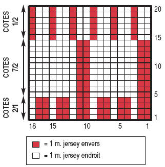A 13-16-19 cm (36-44- 52 rgs) de haut. tot., rab. de ch. 1 fois 2- 3-3 m., puis dim. de ch. côté à 2 m. jersey endr. du bord tous les 2 rgs :
