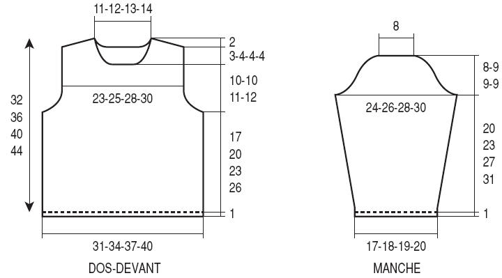 A 10-10-11-12 cm de haut. d’emmanchures (90-100-112-124 rgs de haut. tot.), rab. les 9-11-13-15 m. centrales, puis de ch. côté tous les 2 rgs 1 fois 3 m., 2 fois 2 m., 2 fois 1 m.