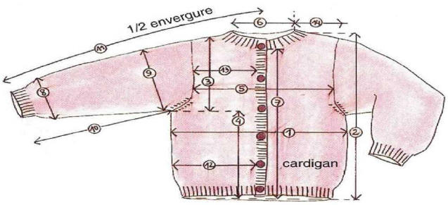 Procéder de la même manière que pour Tricoter un pull-over en jersey pour calculer le dos et les manches. La différence est que le devant est tricoté en deux moitiés. Il faut donc diviser par deux le nombre de mailles du dos diminué de 6 mailles environ pour la largeur de la bande de boutonnage.