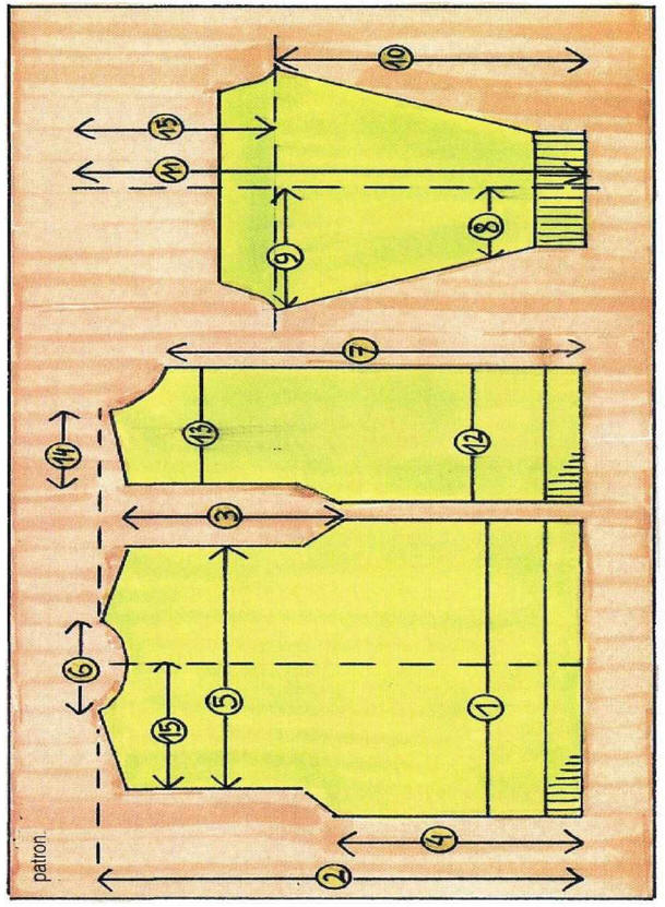 — À X cm de hauteur, rabattre à gauche pour l'encolure, x mailles, 4 mailles, 3 mailles, 2 mailles et 3 fois 1 maille tous les 2 rangs.
