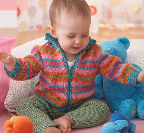 Avec les grandes aig, trav en motif de rayures (en point jersey) EN MÊME TEMPS, aug 1 m à chaque bout du r suiv et de chaque 8ième (6ième-4ième-4ième) r suiv jsq 44 (48-56-58) m.