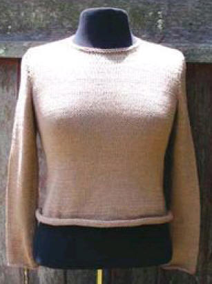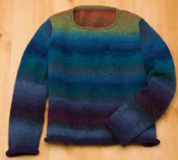 This style is made with simple rolled edges, but you could easily begin with a ribbing along the lower edge and sleeves instead. The yarn can be a simple solid, or a self striping yarn, leaving you to enjoy knitting in stockinette stitch throughout the piece.