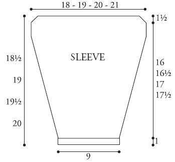 Place markers on side edges of Sleeves ½ (¾-¾-1) inch [1.5 (2-2-2.5) cm] down from markers.