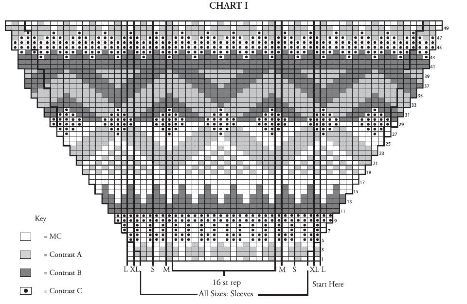 Change to larger needles and cont working Chart I to end of chart, inc 1 st each end of needle on following alt rows to 82 (82-94-94) sts, then every 4th row to 94 (94-100-100) sts.