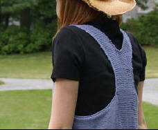 2. Pc is provisionally cast-on slightly offset to the left from the center back, and knit, with a little short row shaping, to the front location of the left strap. The strap length is cast on, then the live stitches are picked up from the provisional cast-on. The strap is knit to the width needed, and then bound off. The back sts are put onto a holder and the front neck shaping is worked. The right strap is cast on and bound off as for the left. The right side is worked, with a little short row shaping, then the garment ends with a graft slightly to the right of the center back.