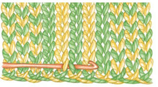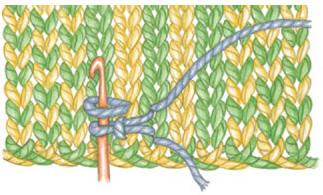 Insert the crochet hook into legs 4 and 5 in the next row of knitting, wrap the yarn over the hook and pull up a loop (you’ll have two loops on the hook).