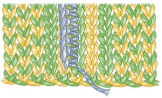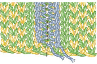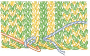 First, choose a crochet hook at least one or two sizes smaller than your main knitting needle, and choose a yarn that is thinner than your main knitting yarn. Be sure that this yarn highly contrasts in color so that you will be sure not to cut this crochet yarn by accident later! (And don’t worry: The yarn will not show on the public side of the garment, so any color can be used.)