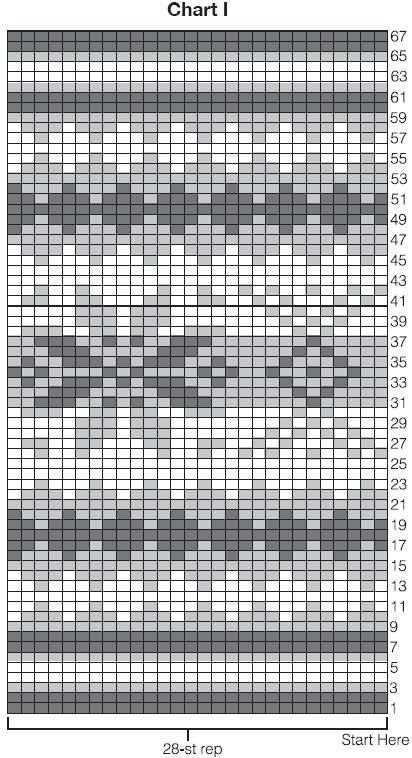 Knit Chart I in rnds to end of Chart, reading rows from right to left and noting 28-st rep will be worked twice.