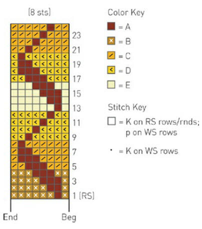 NOTE: On Rnds 2, 4, 6, 8, and 10 only: Purl sts worked in colors B, C, and D,