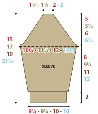 With MC, cont in stocking st inc 1 st each end of following 12th (10th-12th-10th) row(s) from previous inc until there are 32 (34-36-38) sts.