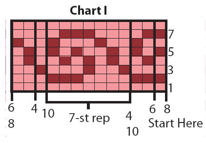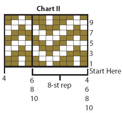Work Chart II in stocking st to end of chart, noting 8 st rep will be worked 11 (12-13-14) times.
