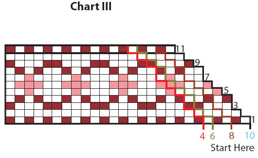 Work Chart III in stocking st to end of chart. 13 (14-16-18) sts.