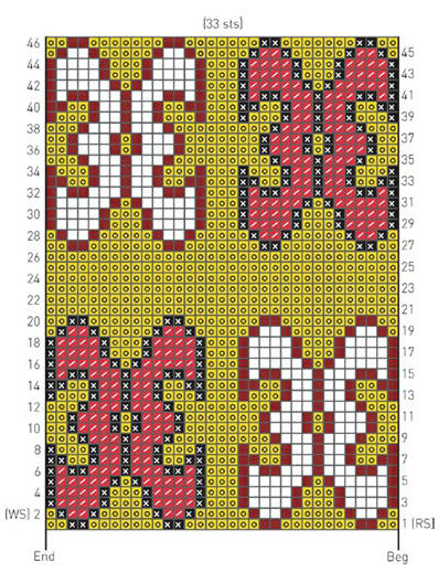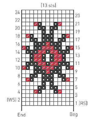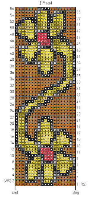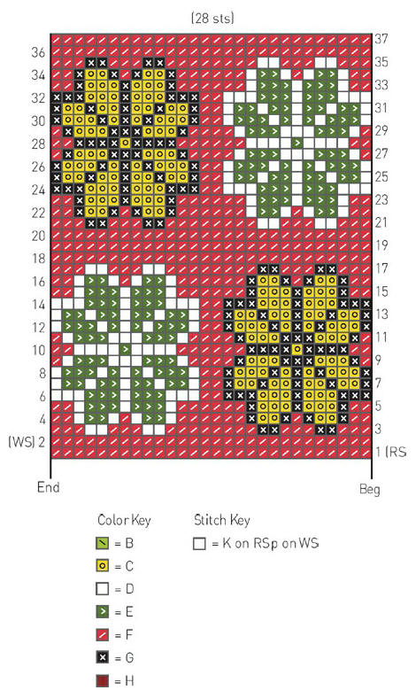 • For the colorwork, use a combination of intarsia, stranded, and duplicate stitch techniques throughout.