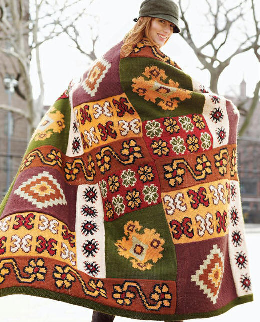 Here’s one of my favorite kinds of projects: Six patterned panels are combined to create a definite showstopper. Since each section is worked separately, it’s perfect take-along knitting!