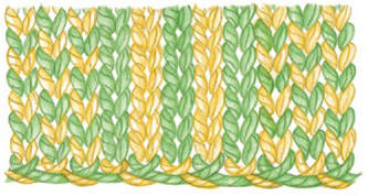 For the steek, a bridge of stitches is cast on using the e-wrap cast-on technique (see below) using alternating colors of yarn.
