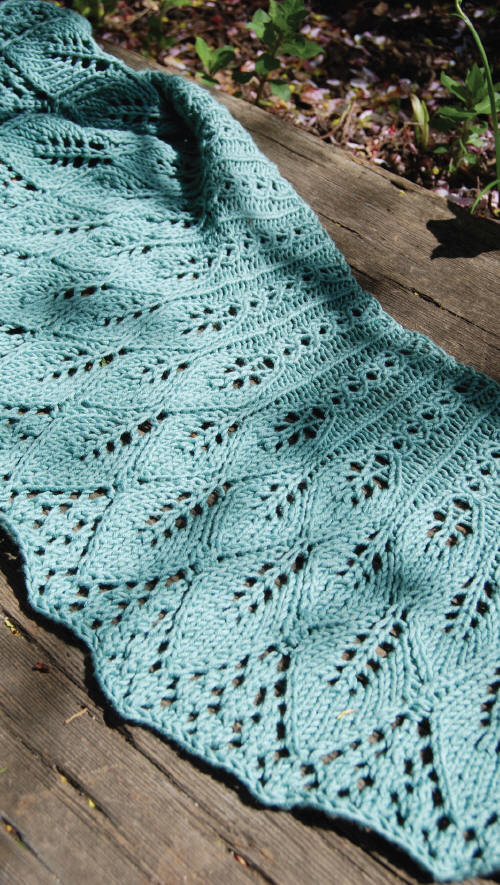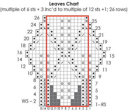 Leaves: (multiple of 6 sts + 3 inc’d to multiple of 12 sts + 1; 26 rows) (also, see chart)
