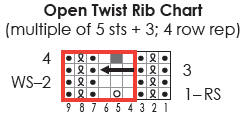 Open Twist Rib: (multiple of 5 sts + 3; 4 row rep) (also, see chart)