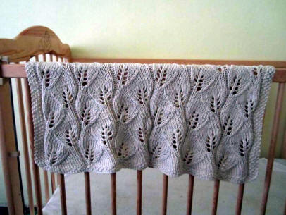 4 sts in seed stitch, 6 repeats of leaf pattern, 4 sts in seed stitch.