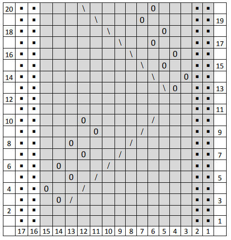 Row 20. k2, (p3, p2tog tbl, p5, yo, p3, k2)
