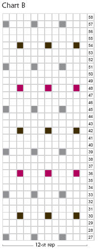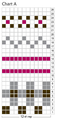 Joining in and breaking off colors as indicated on Chart A, work in stockinette stitch rows 1 through 26.