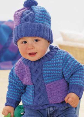 7th row: With A, K0 (0-2-0). P3 (1-3-3). (K3. P3) 3 (4-4-5) times. With MC, work 7th row panel pat. With B, knit to end of row.