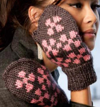 Using yarn needle, B, and Duplicate St, work single motif from red box on Fair Isle Chart at center of top of each mitten (see photo), on back of hand only.