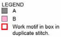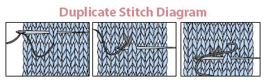 Duplicate Stitch: Using a yarn needle, *bring the yarn from the wrong side of the work to the right side at the base of the knitted stitch to be covered (this is the base of the vee formed by the knitted stitch), take the needle under both arms of the vee, going through the base of the vee of the stitch above, insert the yarn needle back into the same place where you began, taking the yarn to the wrong side of the work, being careful to match the tension of the surrounding knit fabric. Repeat from * for remaining stitches