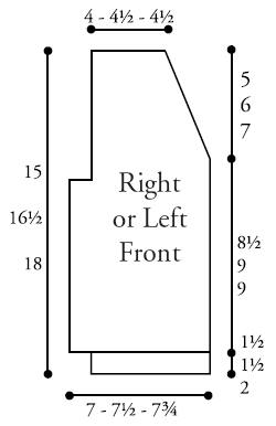 Keeping cont of Chart I, rep last 2 rows 5 times more, then dec 1 st at front edge on following 4th rows until there are 22 (25-25) sts.