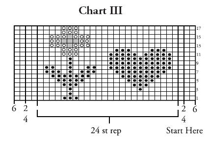 Change to larger needles and work Chart III in stocking st to end of chart, noting 24 st rep will be worked 4 times, reading knit rows from right to left and purl rows from left to right.