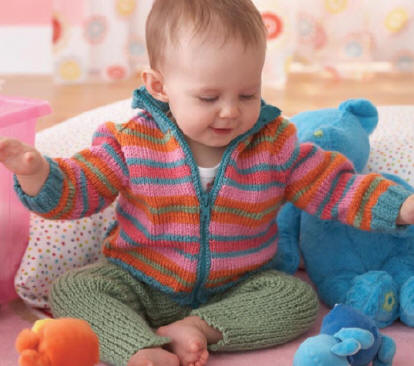 ** Change to larger needles and proceed in Stripe Pat A (in stocking st) until work from beg measures 5 (5½-6-6½)" [12.5 (14-15-16.5) cm], ending with a purl row.