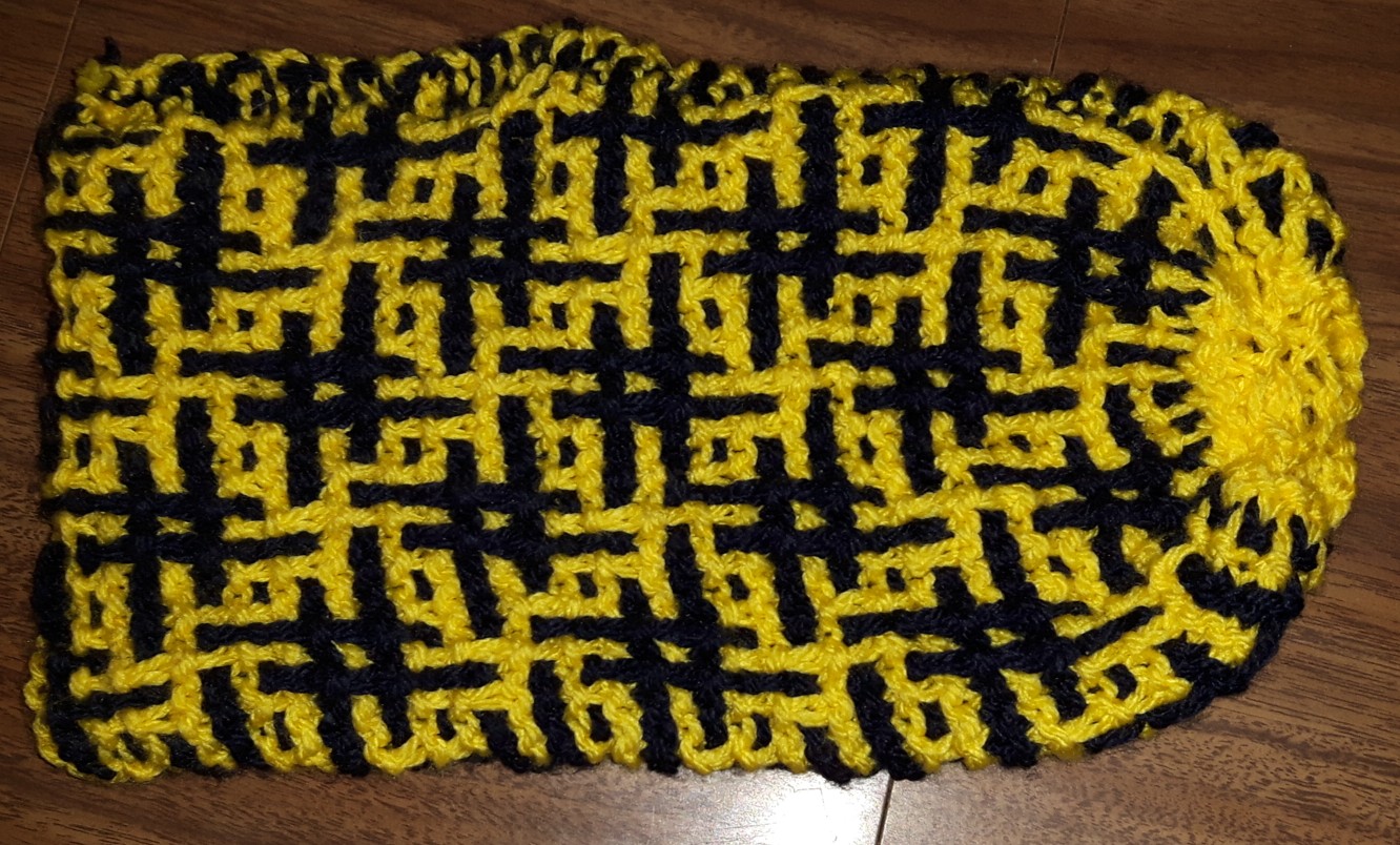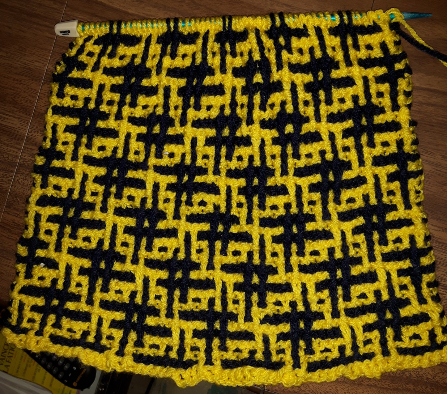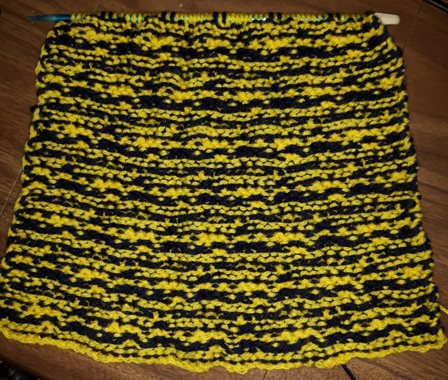 Sur le côté endroit, tricoter un rang avec la laine de couleur principal (Jaune dans la photo).